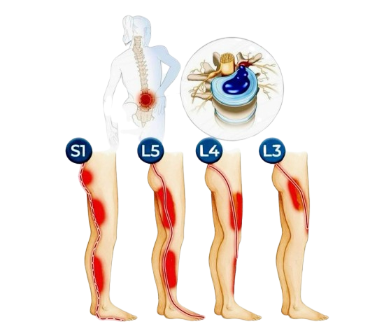L5: W przypadku ucisku lub podrażnienia nerwu L5 ból, mrowienie i drętwienie mogą promieniować do stopy i palucha.